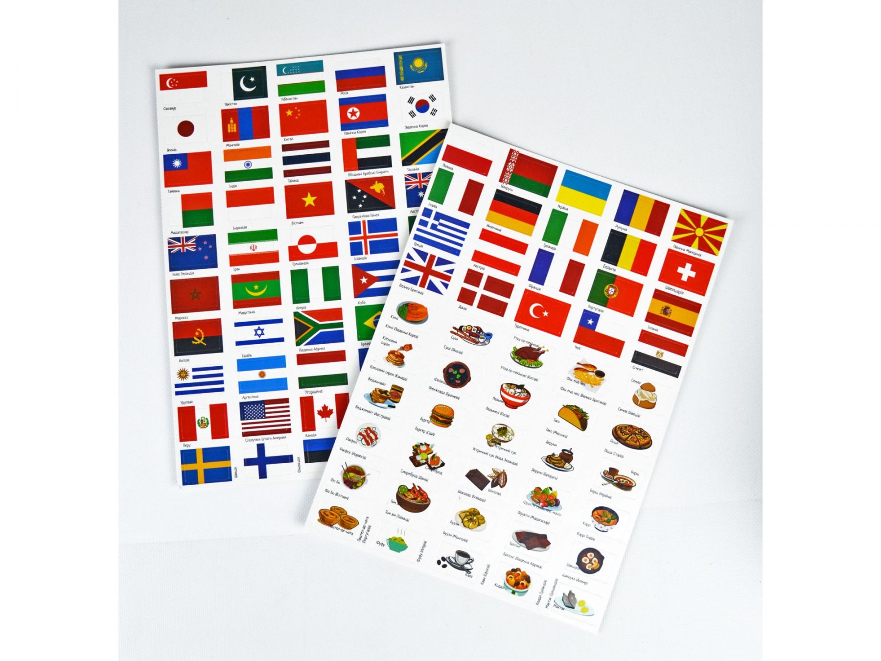 Перед Вами карта світу у виді постеру з багаторазовими наліпками (прапори та національні страви).