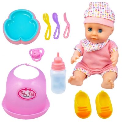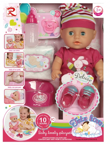 Склад набору: лялька, одяг, взуття, бутилочка, пустушка, памперс, горщик.