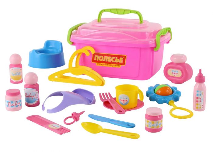 У набір входить: нічний горщик, соска, пляшечка для годування, брязкальце, флакони для присипки, баночки, вішалки, гребінець, слюнявчик, блюдце, чашка, ложка, ніж, виделка. Гра в "дочки-матері" прищеплює дітям турботу про молодших, почуття відповідальності, розвиває уяву та фантазію.