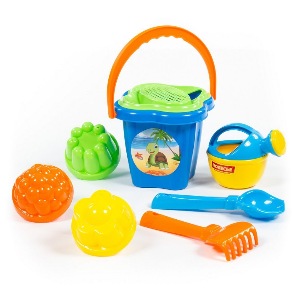 Дитяча іграшка набір для ігор з піском 4481 (відро-квітка середнє, ситечко-квітка, совок №2, грабельки №2, 3 формочки, лійка мала №3)