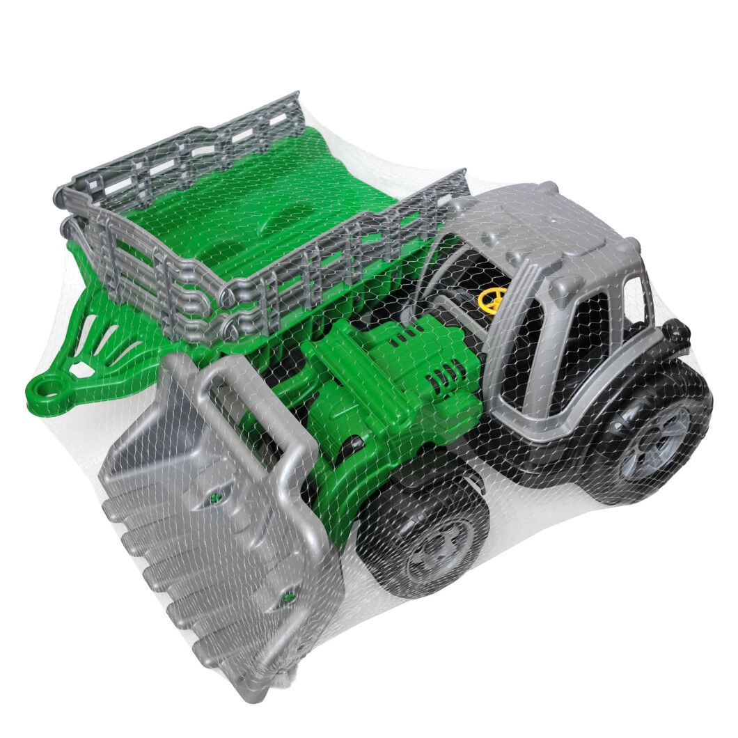 Модель оснащена рухомим переднім ковшем, який дозволяє завантажувати та переміщувати пісок, землю або іграшкові вантажі, а також містким причепом для їх транспортування.