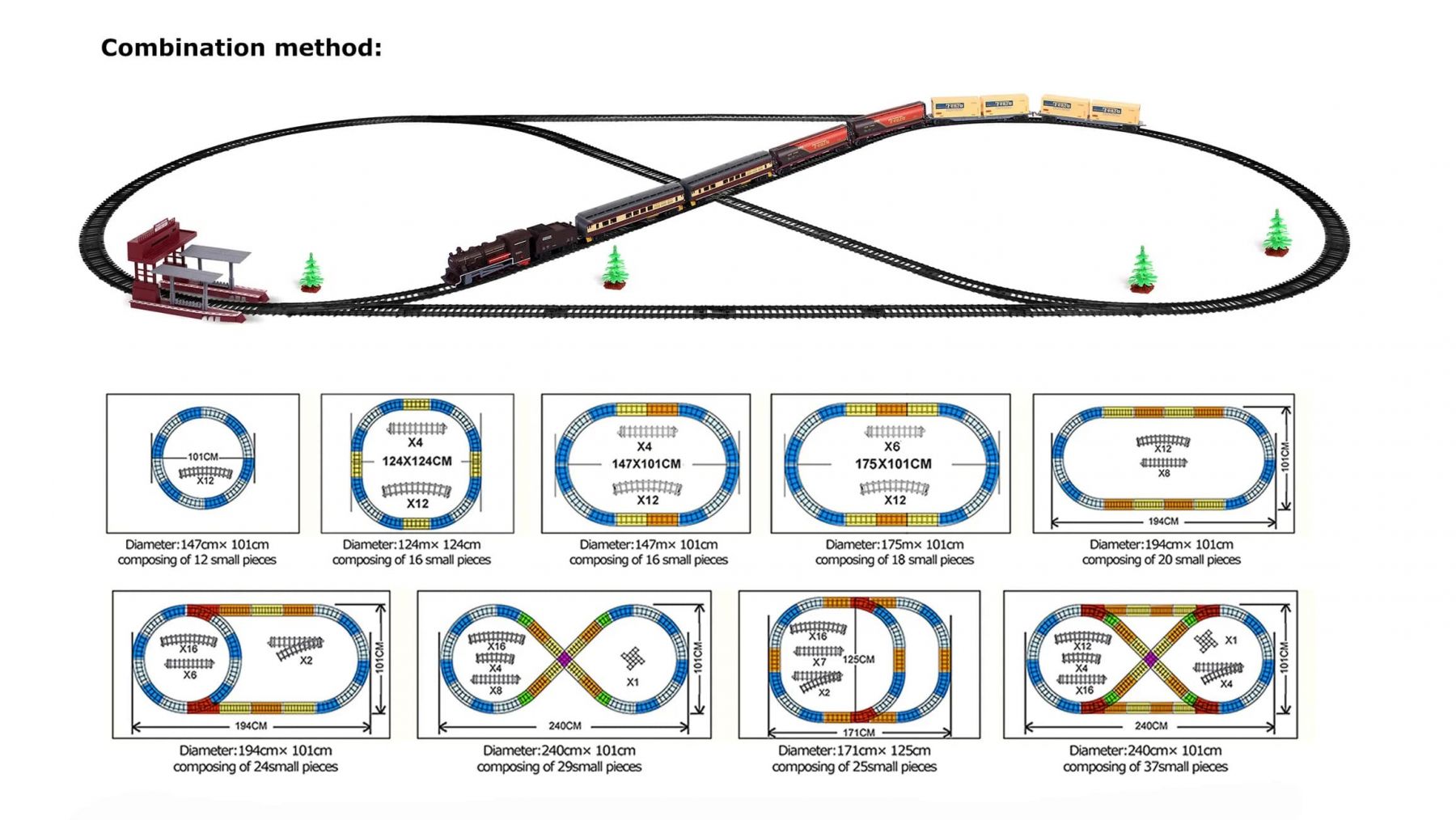 Набір включає як прямі, так і вигнуті рейки, що дозволяє створювати різні конфігурації залізничного полотна (наприклад, овальну або круглу дорогу), також дерева і знаки.