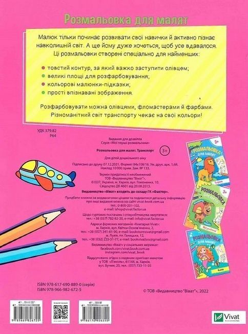 Дитяча книга. серія: розфарбовка для малят книга 3 транспорт 3+ артикул 400616