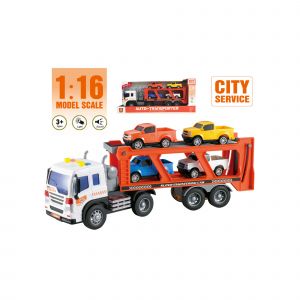 Набір складається з великого вантажного автомобіля-автовоза та чотирьох маленьких машинок-пікапів.