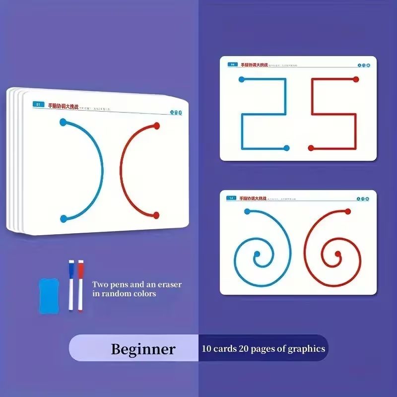 - Картки із завданнями: Набір містить 10 двосторонніх карток (загалом 20 рівнів складності), які мають різні графічні візерунки для тренування.