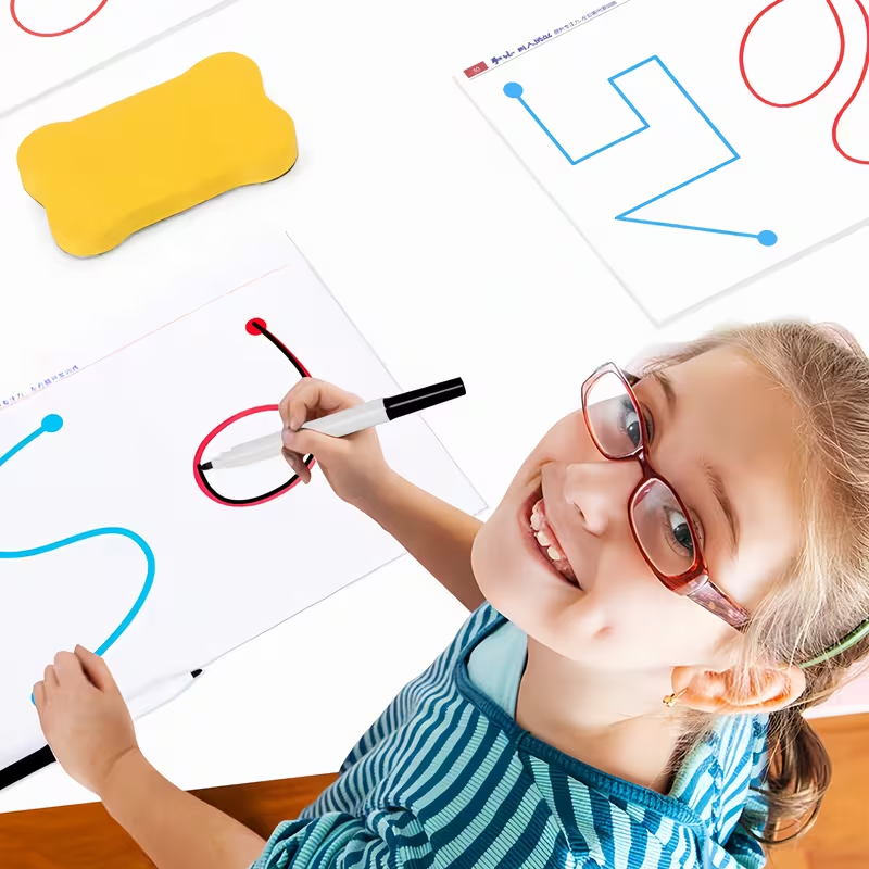 - Багаторазове використання: Завдяки спеціальному покриттю карток та маркерам типу «пиши-стирай», дитина або дорослий може виконувати вправи багато разів.