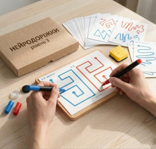 Це нейропсихологічний набір для розвитку міжпівкульної взаємодії та координації рук і мозку, який допомагає покращити концентрацію, увагу та дрібну моторику у дітей та дорослих за допомогою вправ на обведення траєкторій одночасно обома руками.