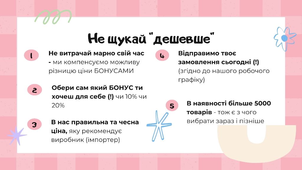 - Економія вашого часу - немає необхідності шукати дешевше - ми компенсуємо різницю ціни бонусами