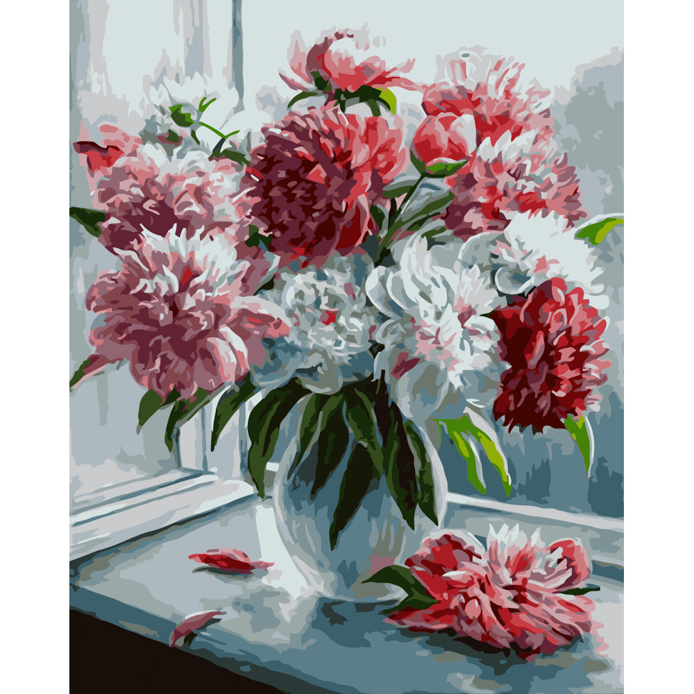 Живопис розпис картина за номерами Букет піонів біля вікна Strateg розміром 40х50 см (GS071)