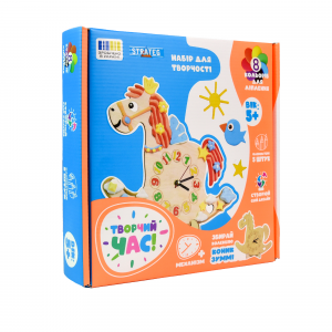 Набір для творчості «Творчий час. Коник Зуммі» — це чудова можливість створити свій власний унікальний годинник. Він стане прикрасою дитячої кімнати та допоможе малюку вивчити час. У наборі на вас чекає дерев'яна основа коника, годинниковий механізм, а ще повітряна маса та фломастери для прикрашання.