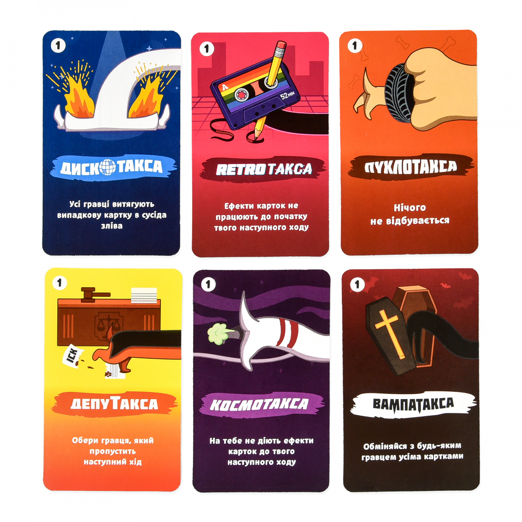 «Таксатека» — настільна гра для компанії, де швидкість думки й хитрість вирішують усе. Комбінуй і обмінюй картки, щоб зібрати сет і випередити суперників.
