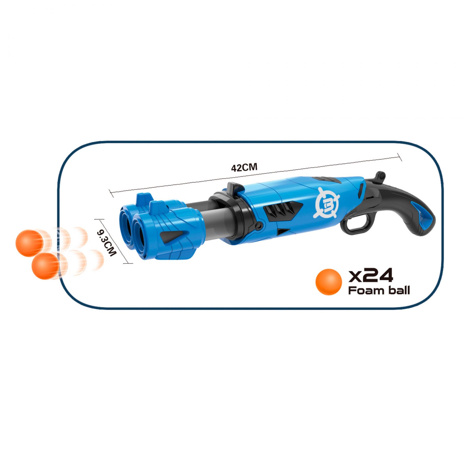 Бластер має міцну та довговічну пластикову конструкцію, має два стовбури та яскравий дизайн, представлені в двох кольорах (помаранчевий чи синій).
