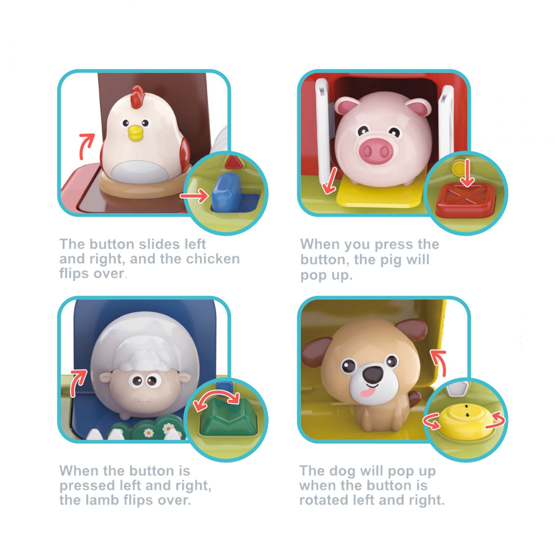 У ній передбачено різні механічні дії (натискання, поворот, зсув кнопок), при виконанні яких з будиночків вискакують фігурки тварин.
