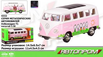 Дитяча іграшка АВТОБУС металевий Volkswagen T1 АВТОПРОМ 4332 рожев. колір, відч.двері, в кор. 14,5*6,5*7см Машина металева (1:38) Volkswagen T1 - металева машина з елементами, що відкриваються, неодмінно сподобається вашій дитині. Іграшка виготовлена з якісних матеріалів і виглядає досить реалістично. Рекомендований вік: c 3-х років; Матеріал: метал.