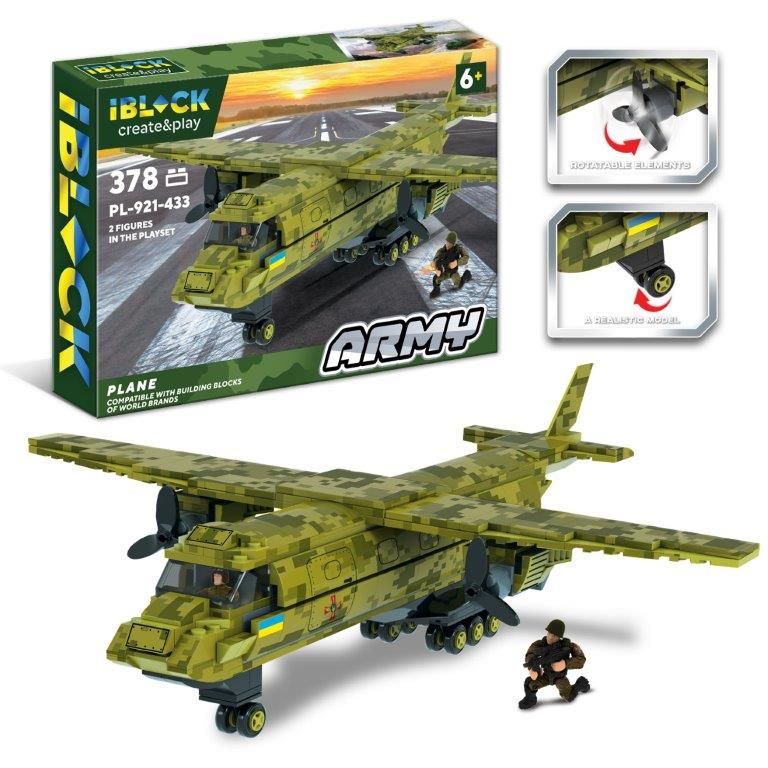 Дитяча іграшка конструктор військовий вантажний літак IBLOCK PL-921-433 АРМІЯ 378 деталей