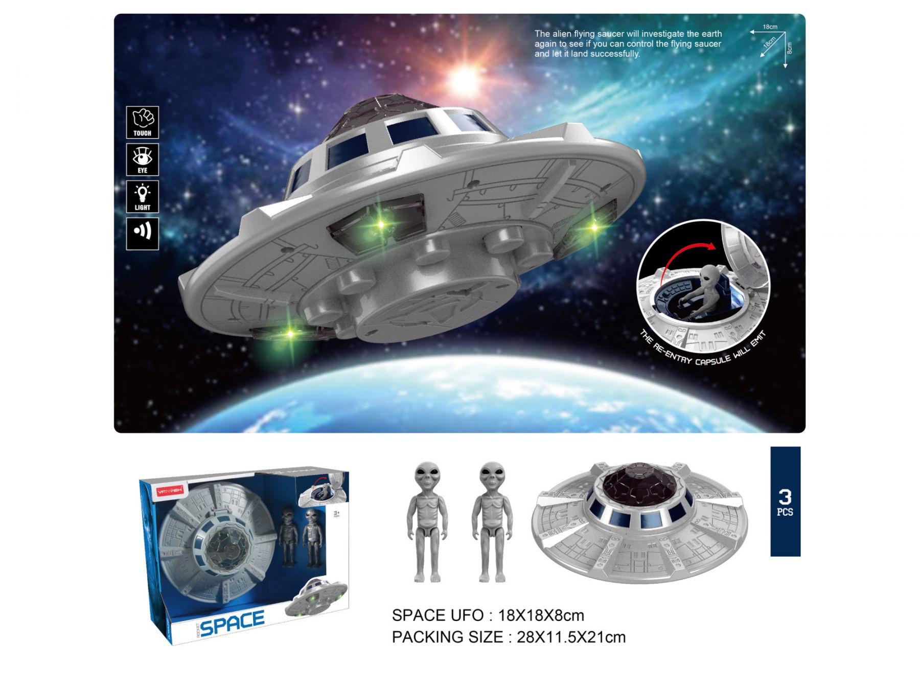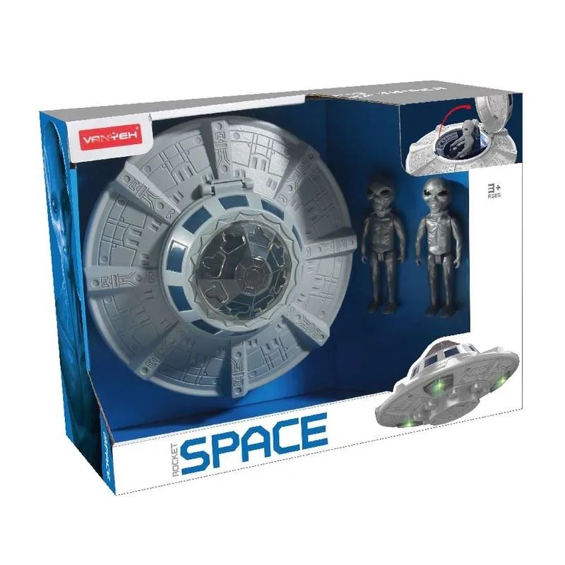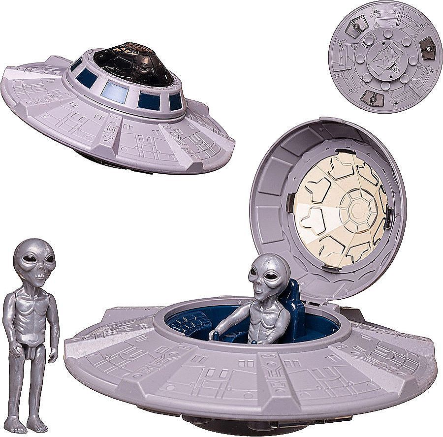Тарілка має відсік, що відкривається для розміщення пілота всередині, яскраве підсвічування. У фігурок космонавта рухливі руки, ноги.