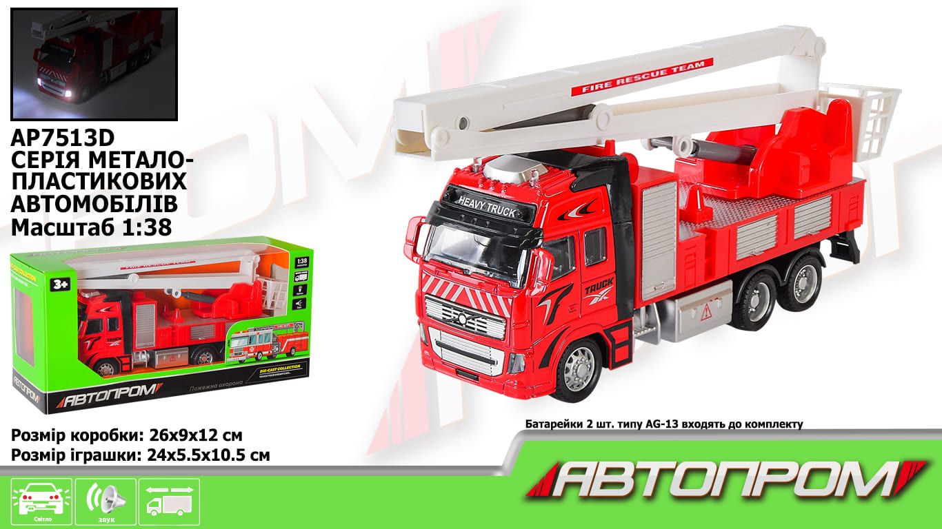 Дитяча іграшка машинка металева AP7513D АВТОПРОМ 1:38 пожежна охорона світло звук батарейки короб.25,5 * 12 * 9см