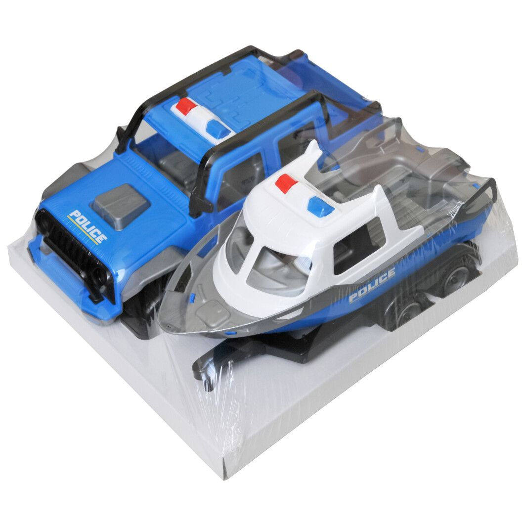 Поліцейський джип із серії “Титан” у комплекті з причепом та катером створений для активних і захопливих ігор маленьких захисників порядку.