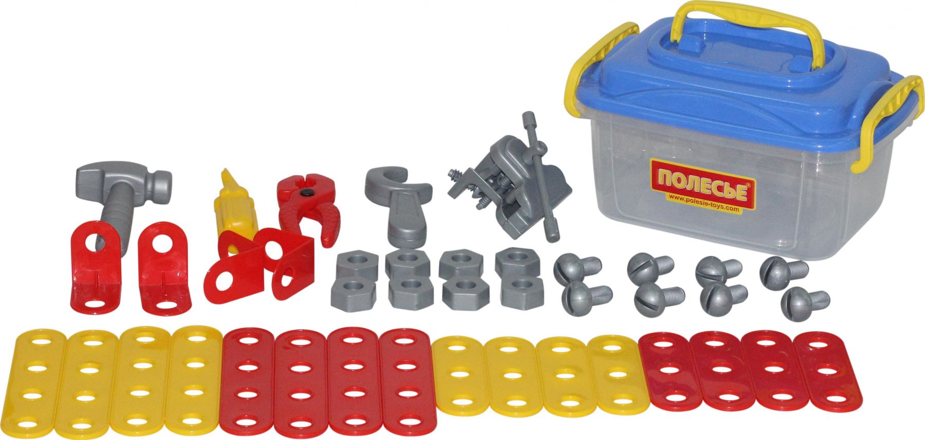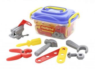 Набір для хлопчиків, що складається з викрутки, гайкового ключа, пасатижів, молотка, слюсарних лещат, а також сполучних пластин, куточків, гвинтів та гайок. Набір чудово підійде для першого знайомства хлопчика зі слюсарним інструментом, його призначенням, принципами роботи. Укомплектований контейнер, який спрощує переміщення іграшки. Упакування: контейнер. Матеріал виконання: пластик. Розмір в упаковці: 285х195х155 мм.