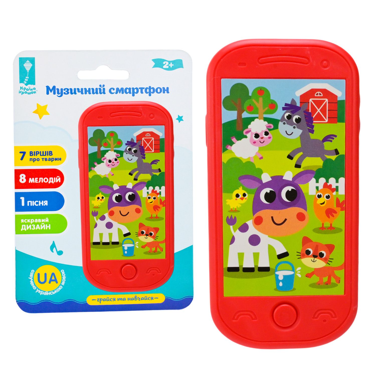 - іграшка відтворює 7 віршиків про тварин, 8 мелодій, 1 пісня, які озвучені українською мовою;
