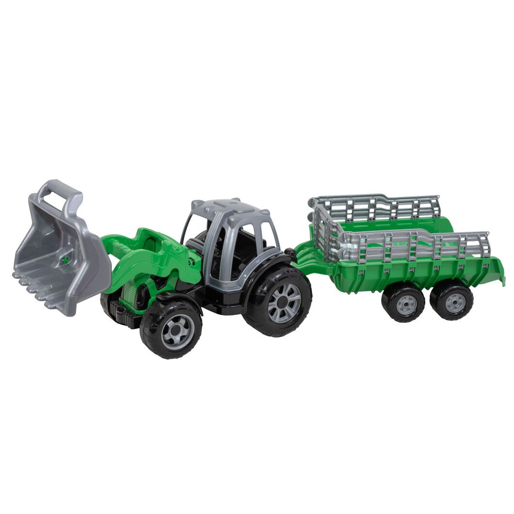 Модель оснащена рухомим переднім ковшем, який дозволяє завантажувати та переміщувати пісок, землю або іграшкові вантажі, а також містким причепом для їх транспортування.