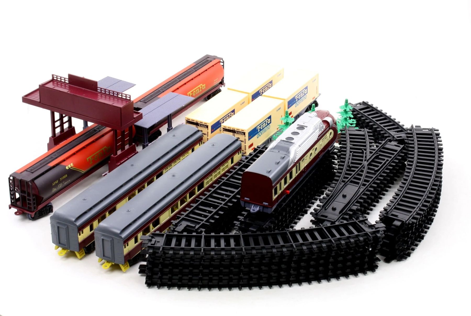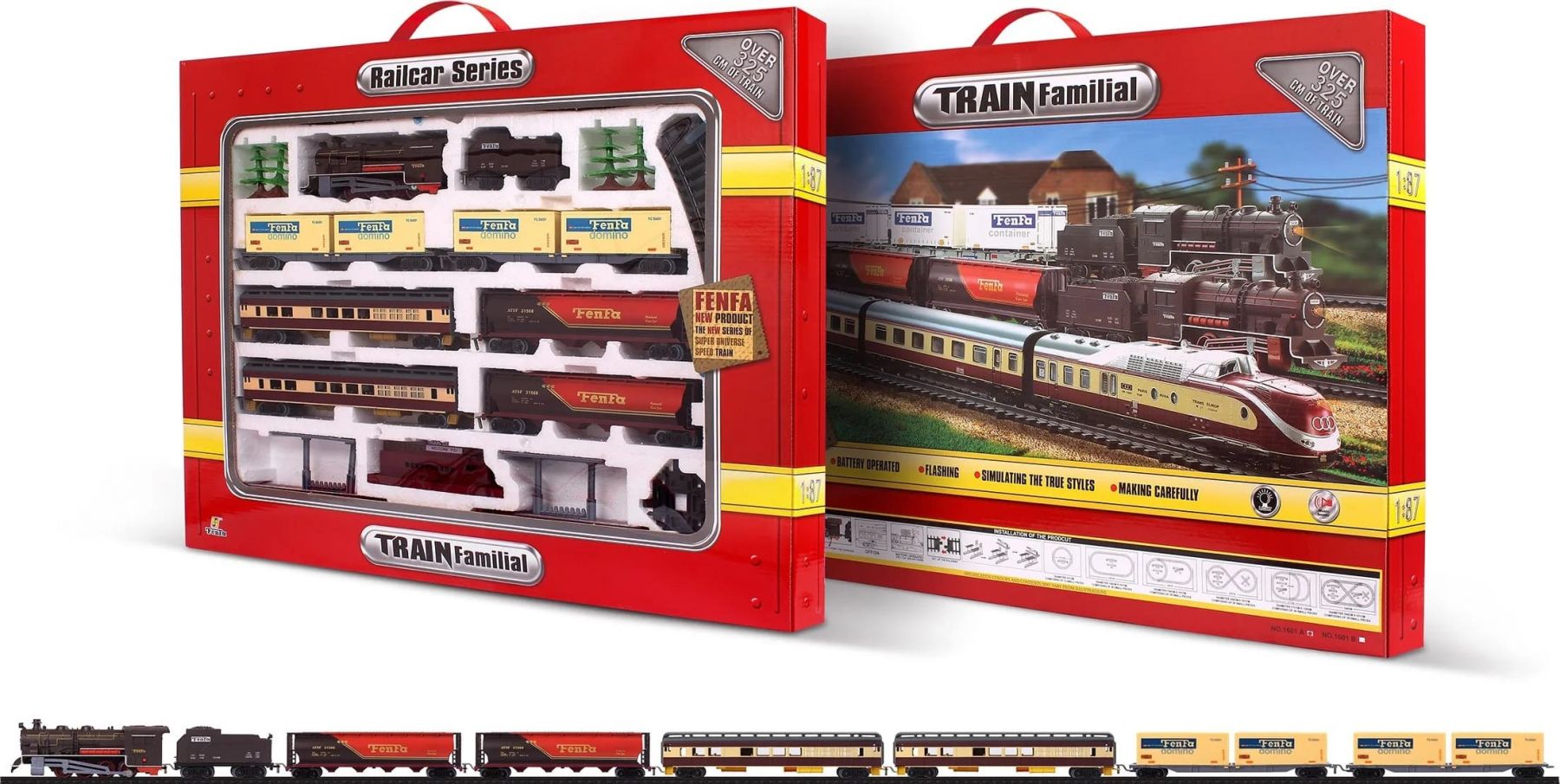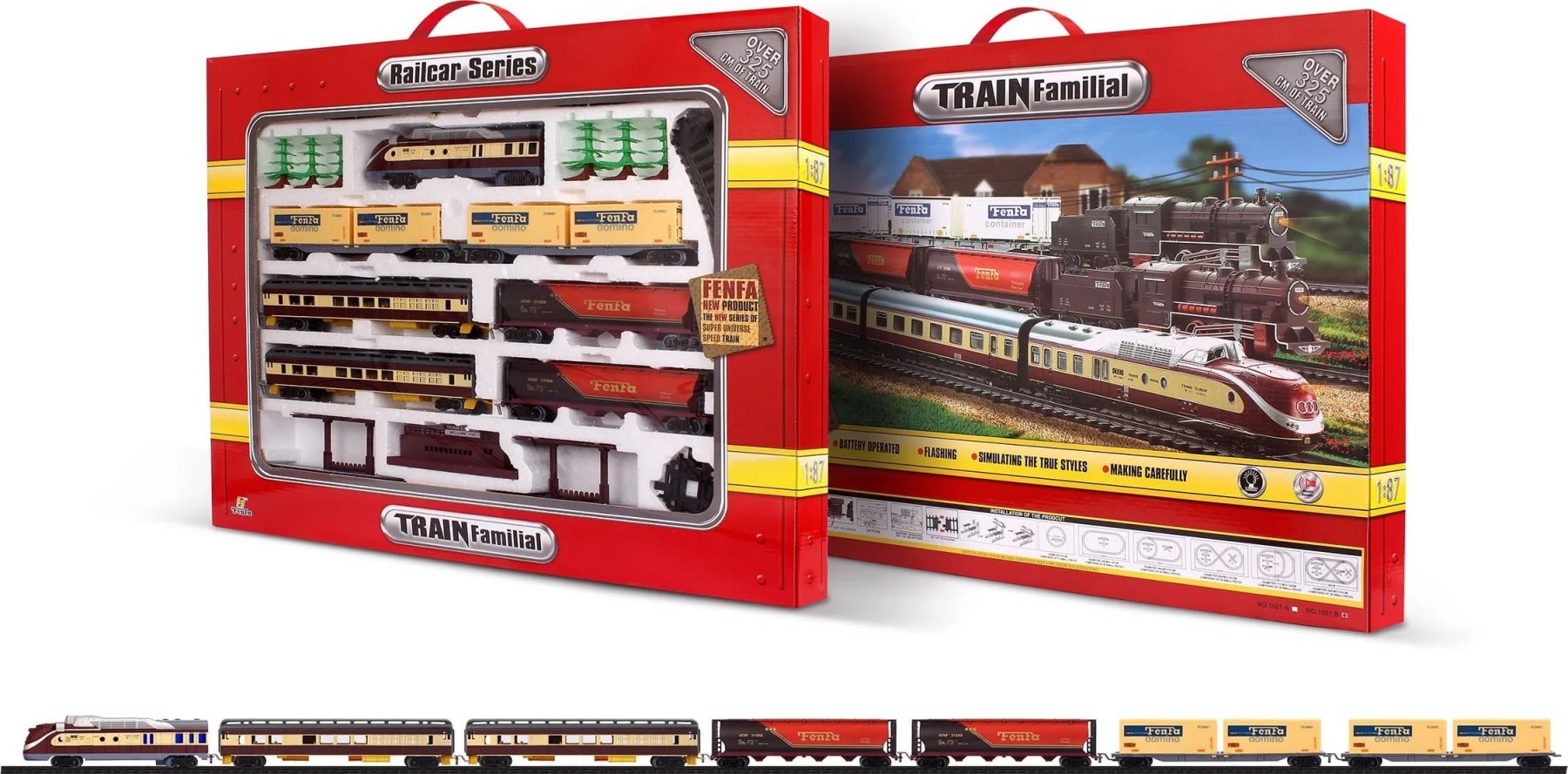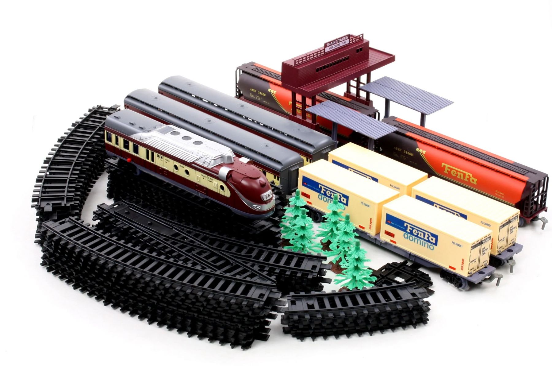 Переваги залізниць FENFA міцний пластик, надійні кріплення рейок та вагонів, вагони та локомотиви виконані красиво та детально. Економія живлення завдяки малій вазі та легкості ходу коліс.