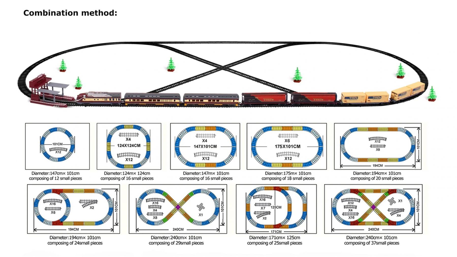 Набір включає як прямі, так і вигнуті рейки, що дозволяє створювати різні конфігурації залізничного полотна (наприклад, овальну або круглу дорогу), також дерева і знаки.