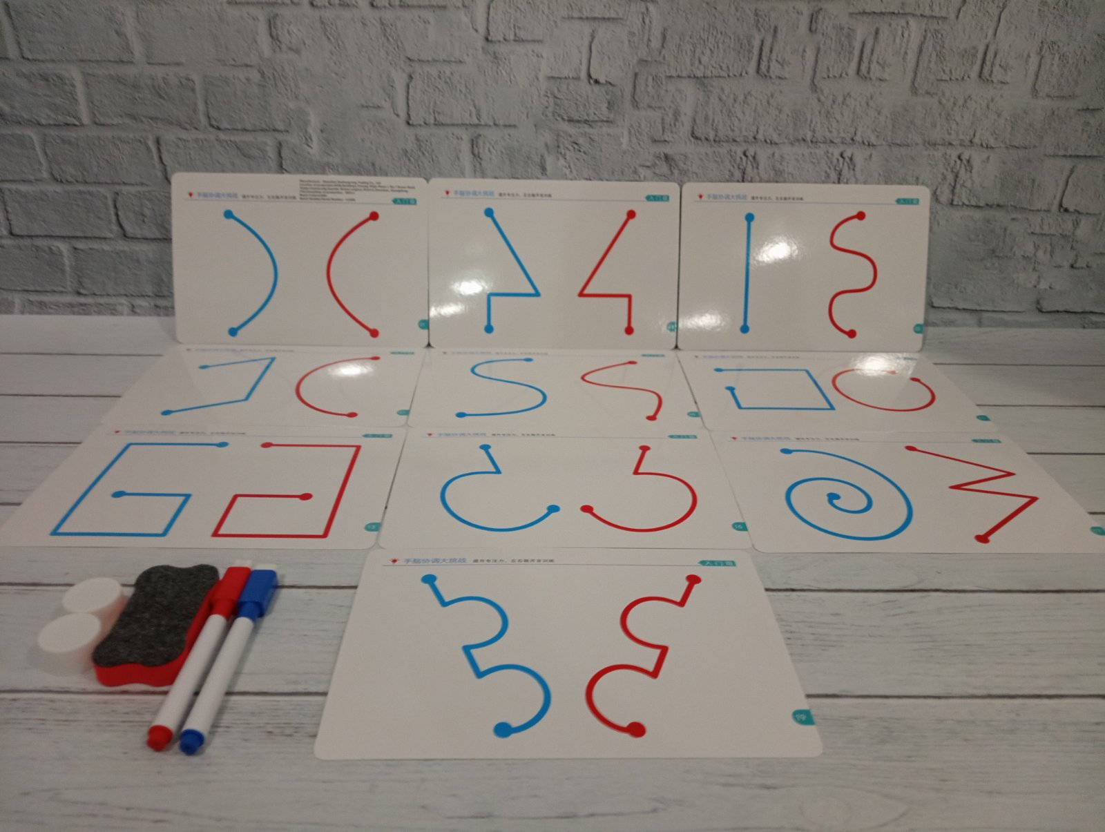 - Картки із завданнями: Набір містить 10 двосторонніх карток (загалом 20 рівнів складності), які мають різні графічні візерунки для тренування.