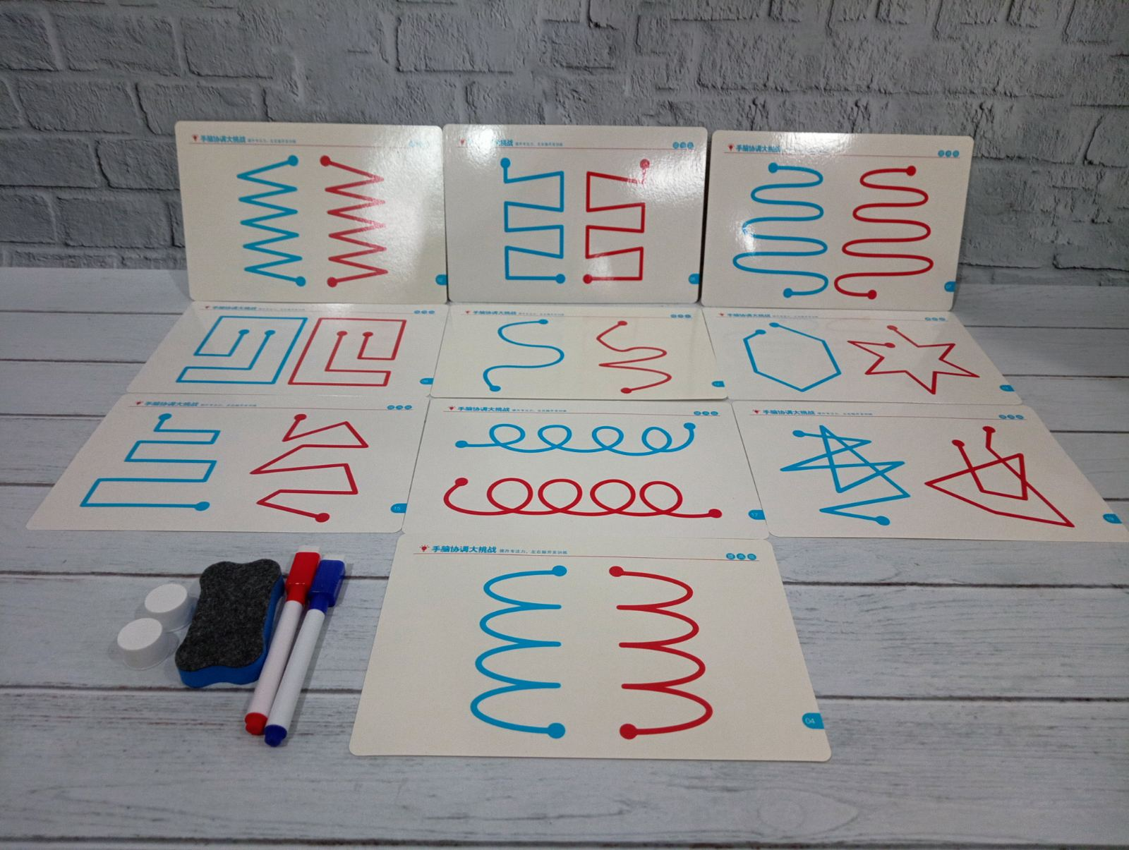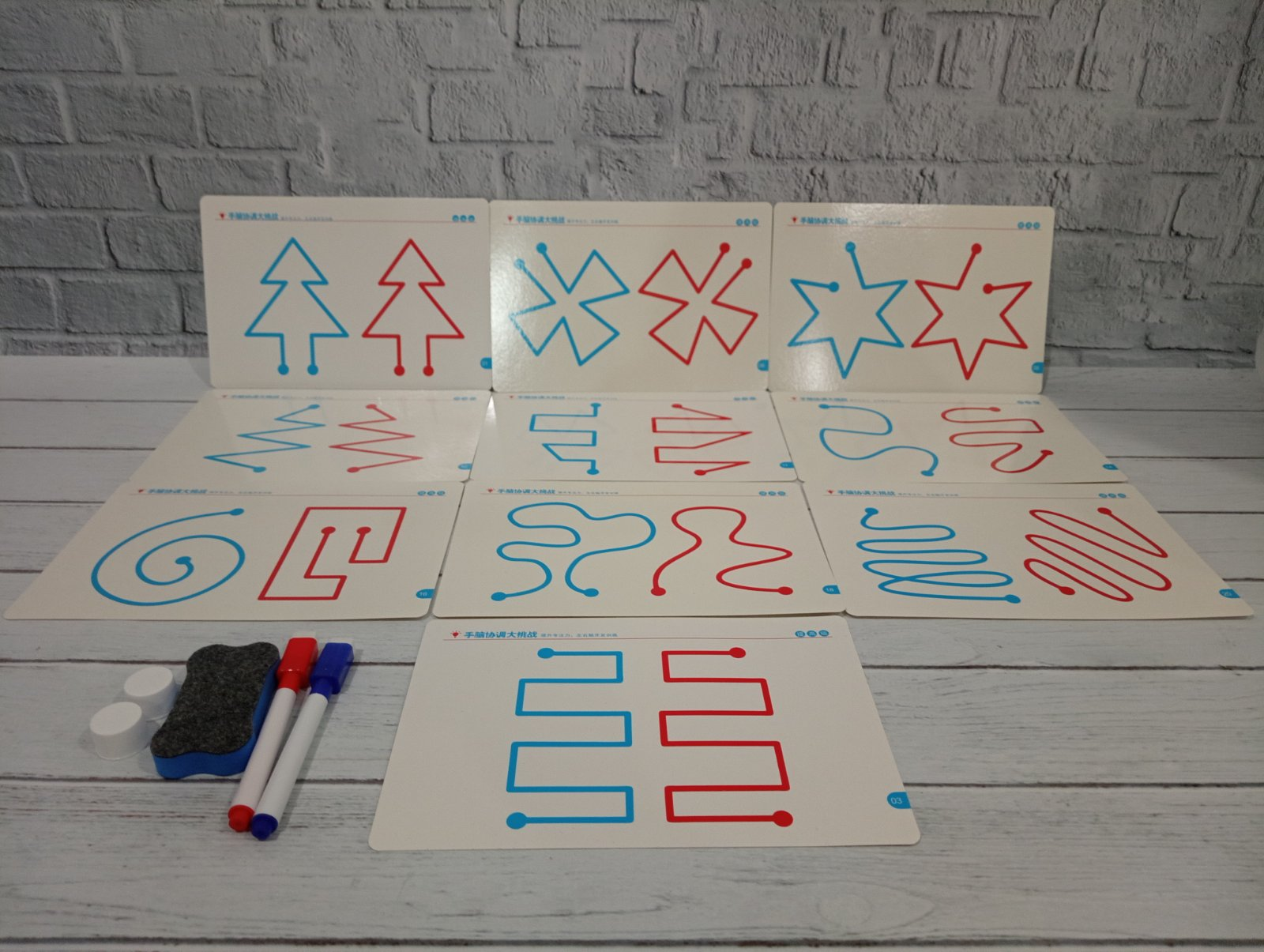 - Картки із завданнями: Набір містить 10 двосторонніх карток (загалом 20 рівнів складності), які мають різні графічні візерунки для тренування.