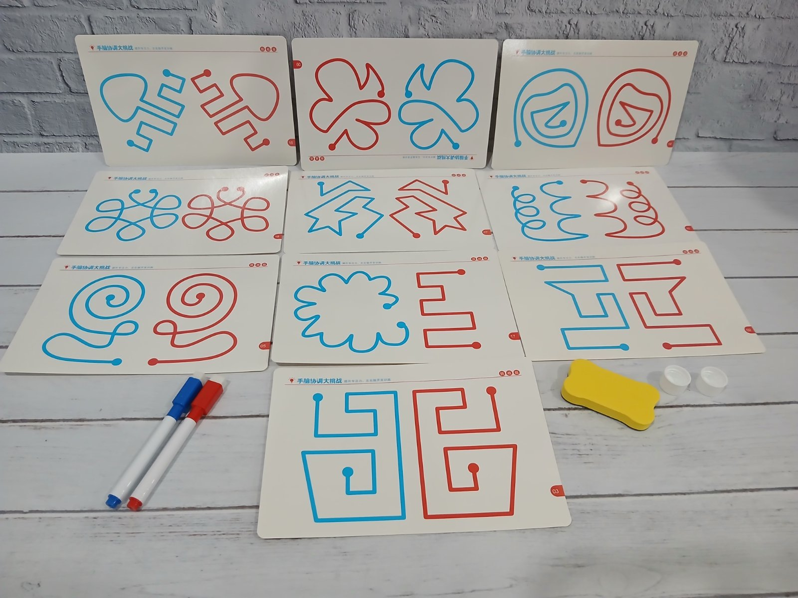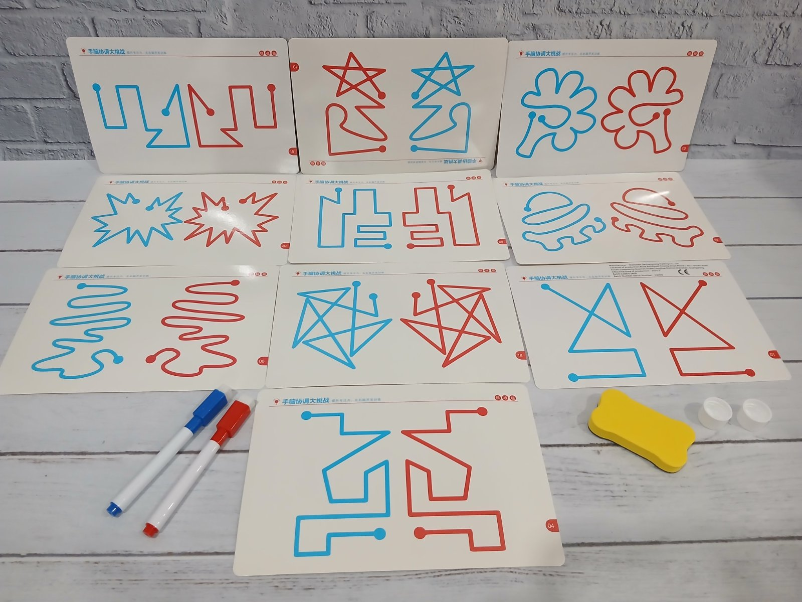 - Картки із завданнями: Набір містить 10 двосторонніх карток (загалом 20 рівнів складності), які мають різні графічні візерунки для тренування.