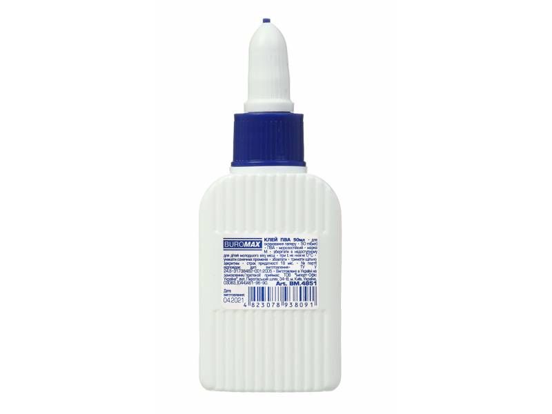 Характеристики: об'єм: 50 мл; для склеювання паперу, картону, фотографій, текстилю, дерева; на основі PVA (полівінілацетат); не токсичний; легко змивається водою; зберігає свої властивості при низьких температурах; ковпачок захищає клей від пересихання та слугує дозатором при нанесенні на поверхню; призначений для використання в офісі, школі, вдома і в будівництві.