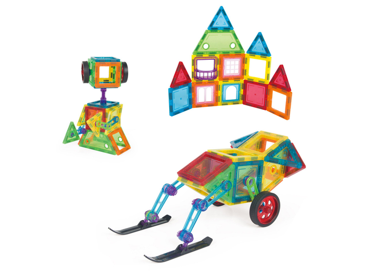 Конструктор включає в себе магнітні рамки різних геометричних форм і колісні пари.