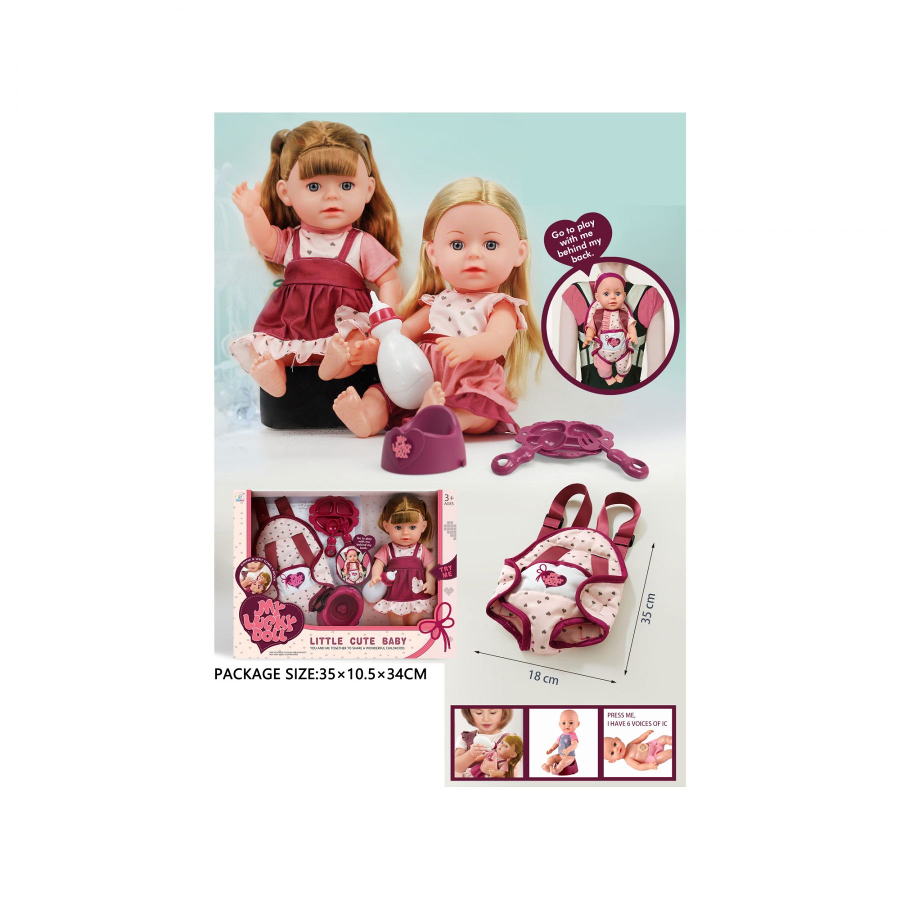 Дитяча іграшка лялька п'є воду, пісяє ,з рюкзаком, розмір 35 см 59013 KaiHan®, відео в описі