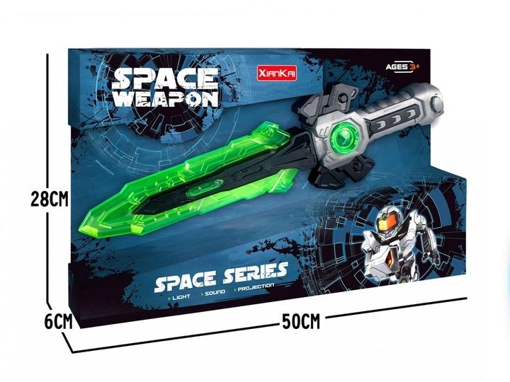 Космічна зброя "SPACE меч" - це захоплююча новинка, що поєднує у собі фантастичні світлові та звукові ефекти. Виготовлений із якісних матеріалів, цей меч здатний перетворити дитячі ігри на захоплюючі космічні пригоди.