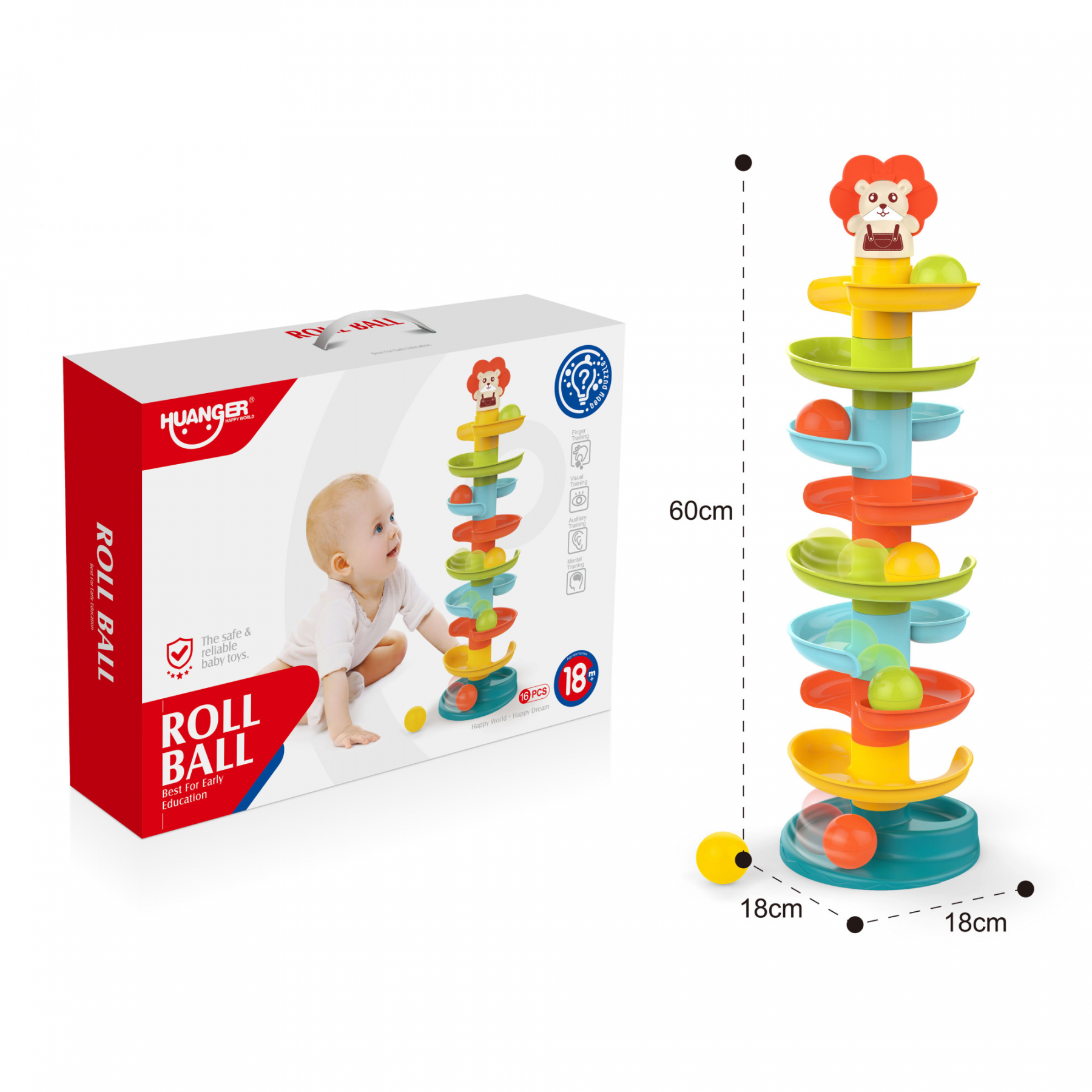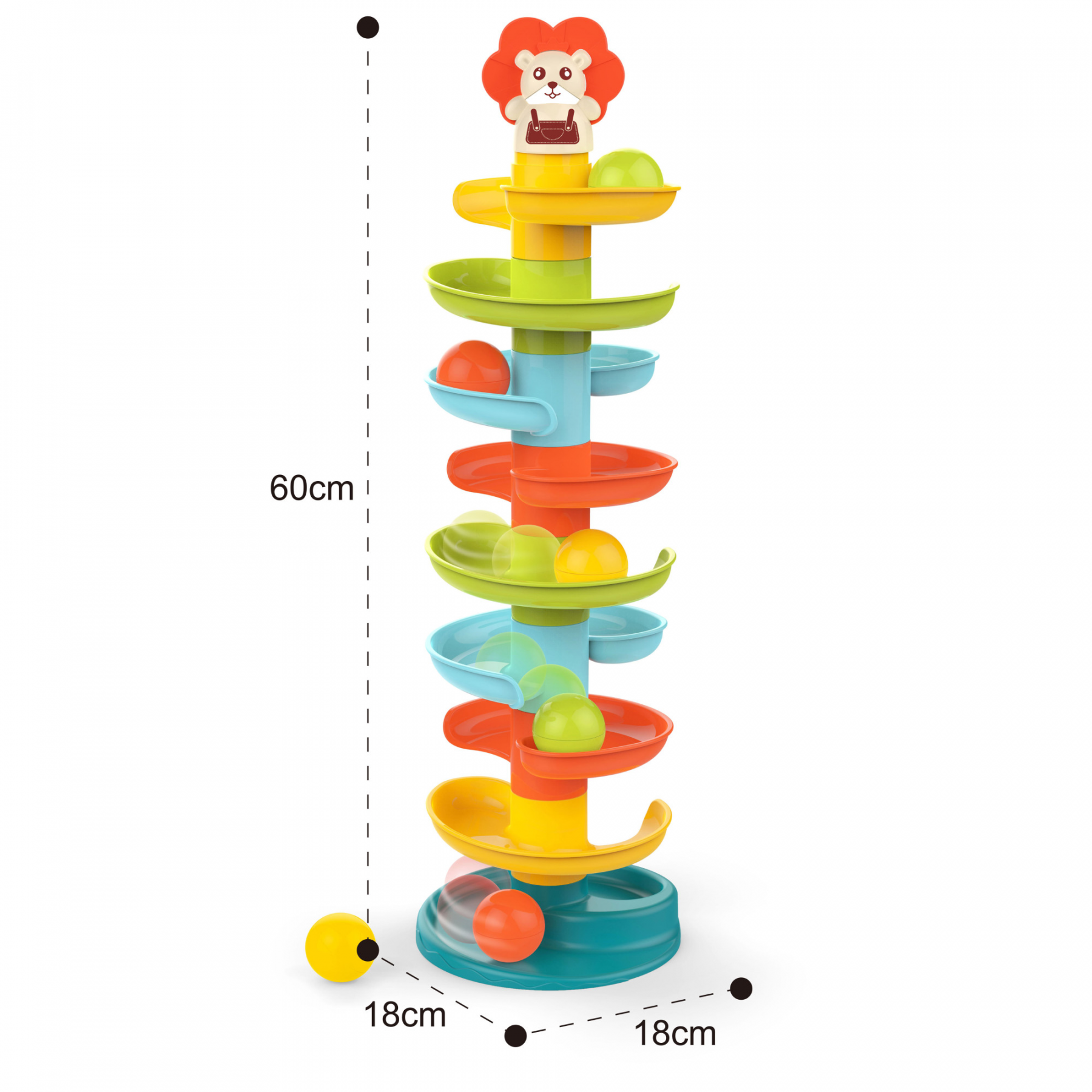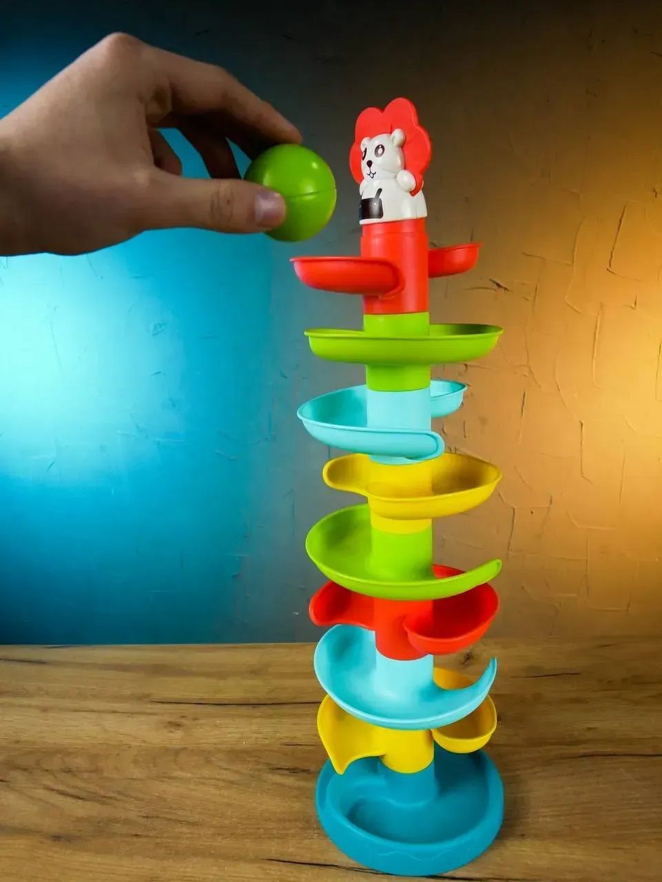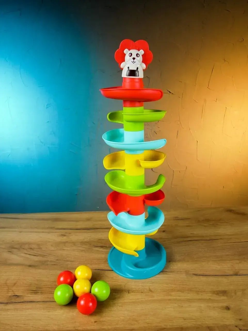 Яскрава та безпечна розвивальна іграшка для найменших — багаторівнева гірка з кульками і милою фігуркою на верхівці.