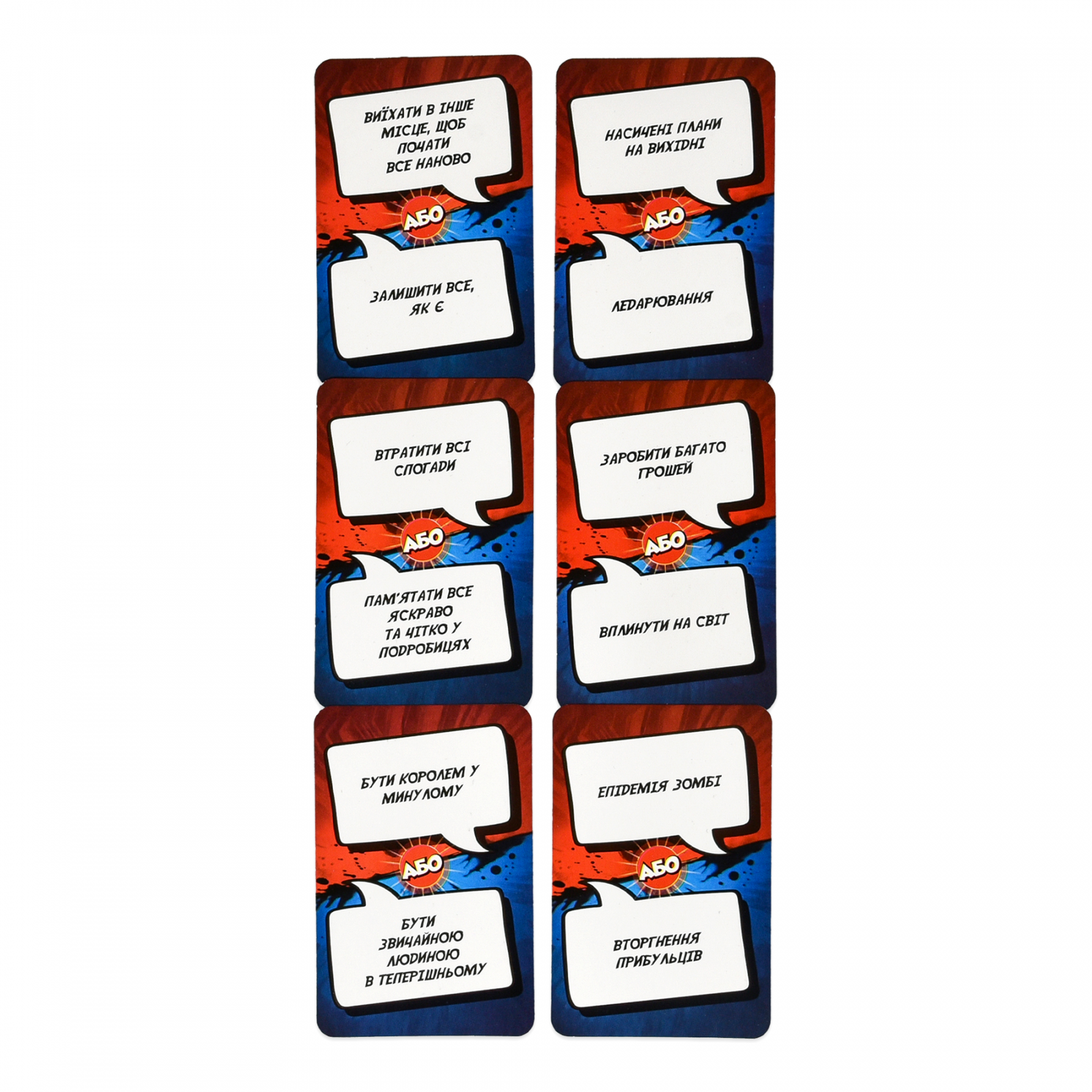 «Одне з двох» — настільна гра для компанії, щоб весело провести час і краще пізнати одне одного. На картках — два варіанти, обрати можна лише один.