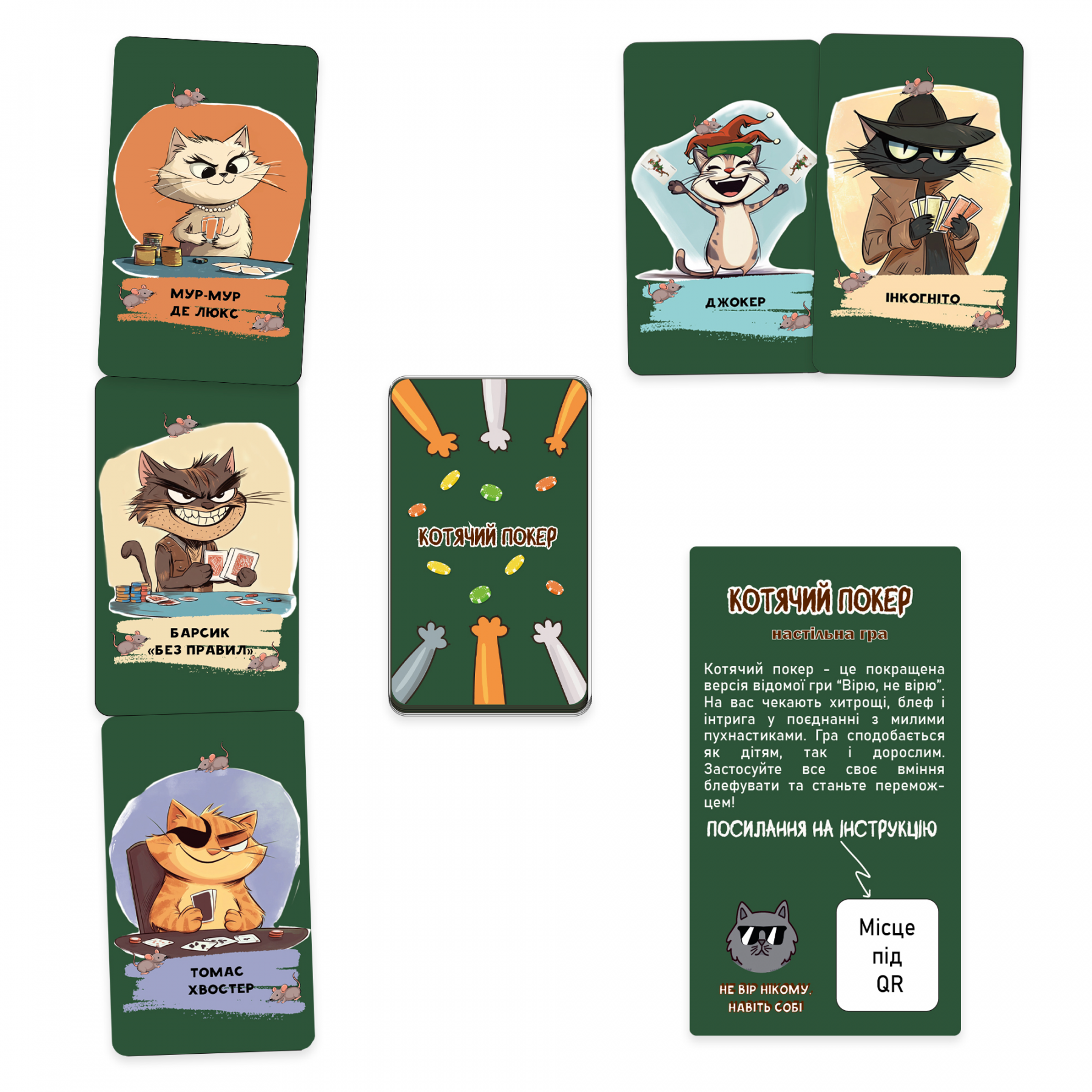 «Котячий покер» — це покращена версія відомої гри «Вірю — не вірю». Проста, весела настільна гра, де хитрощі блеф та інтрига поєднуються з милими пухнастиками.