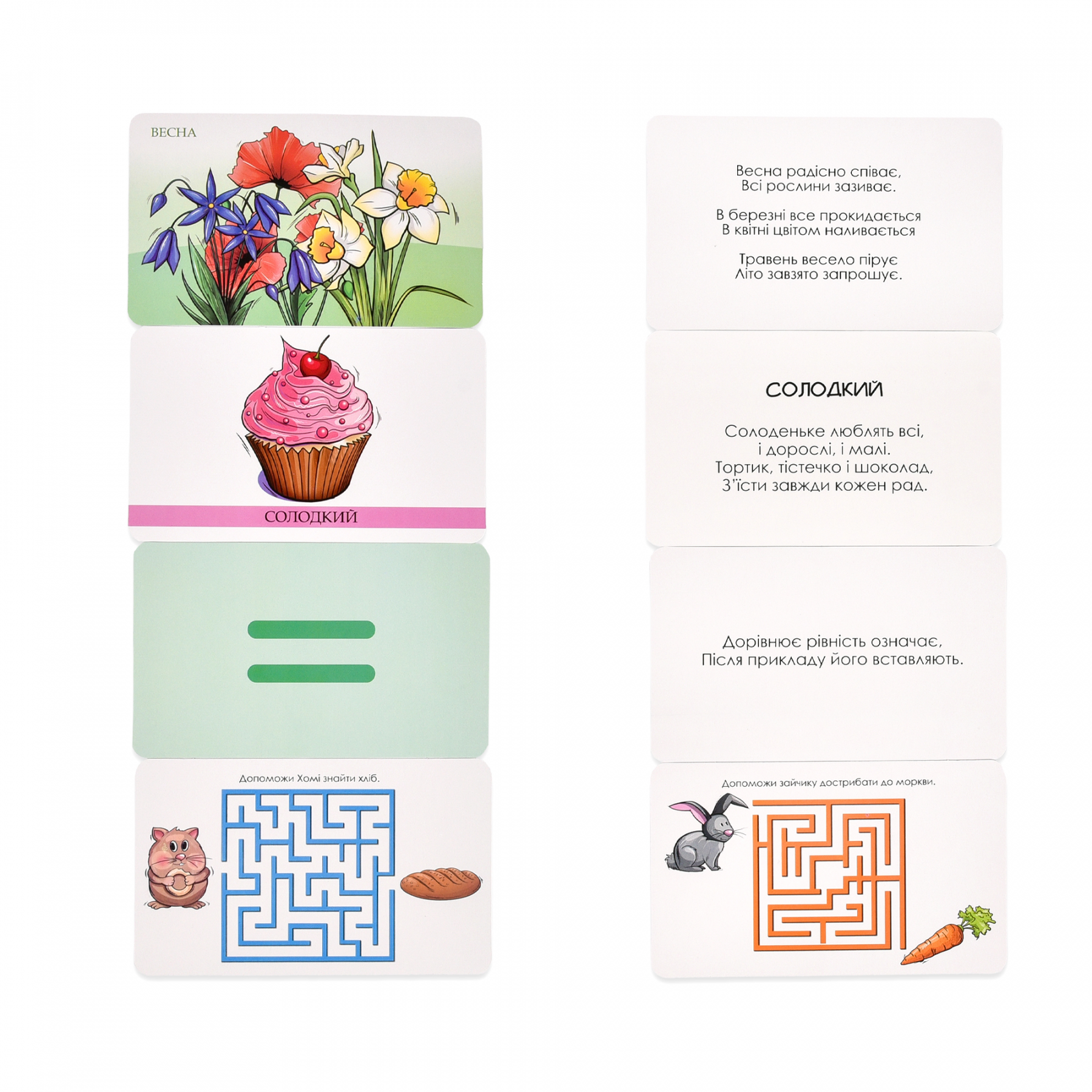 Комплект з 80 різних карток познайомить дитину з абеткою, цифрами, смаками та кольорами.