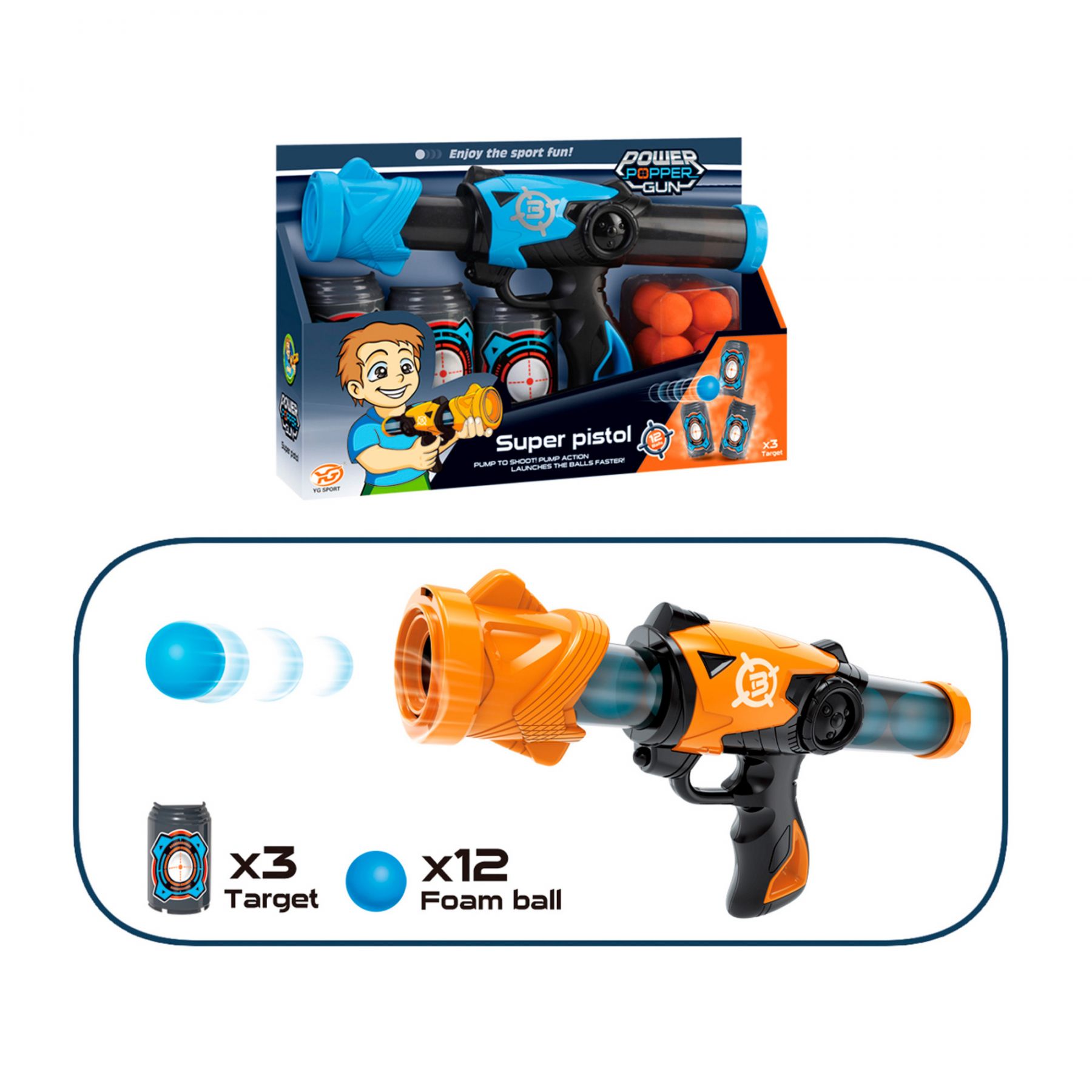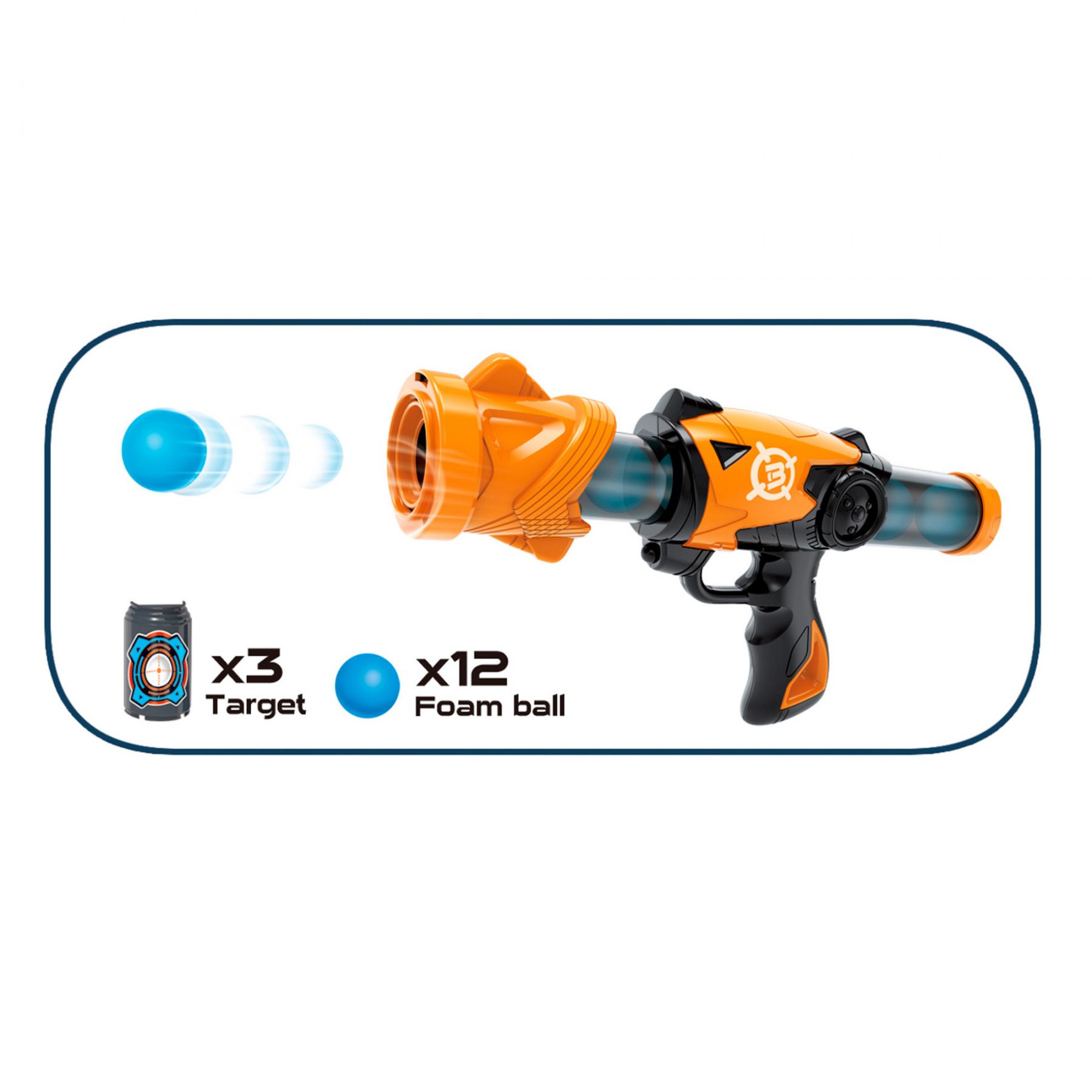 У комплекті - помповий бластер, 12 м'яких кульок, 3 мішені у вигляді банок.