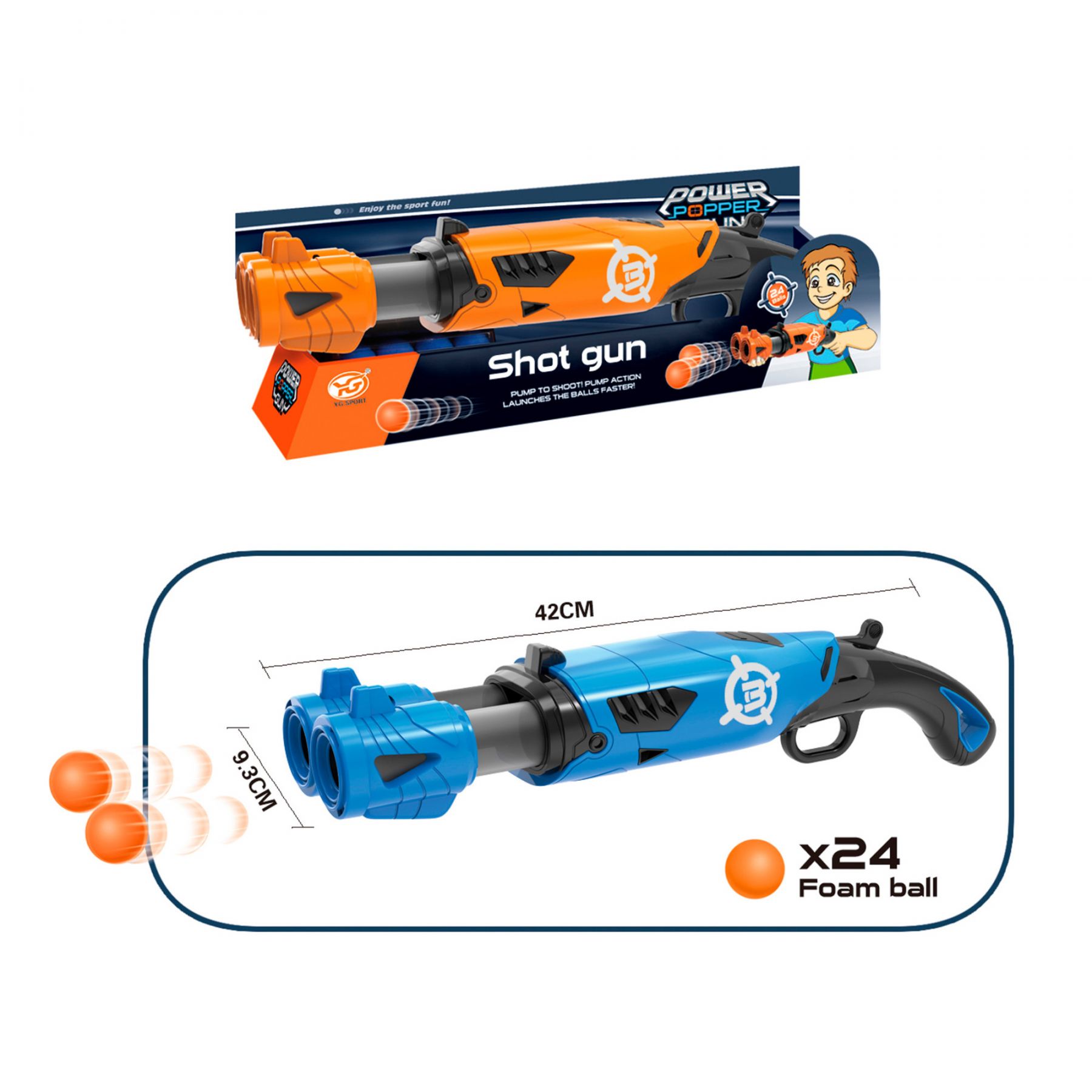 Бластер має міцну та довговічну пластикову конструкцію, має два стовбури та яскравий дизайн, представлені в двох кольорах (помаранчевий чи синій).