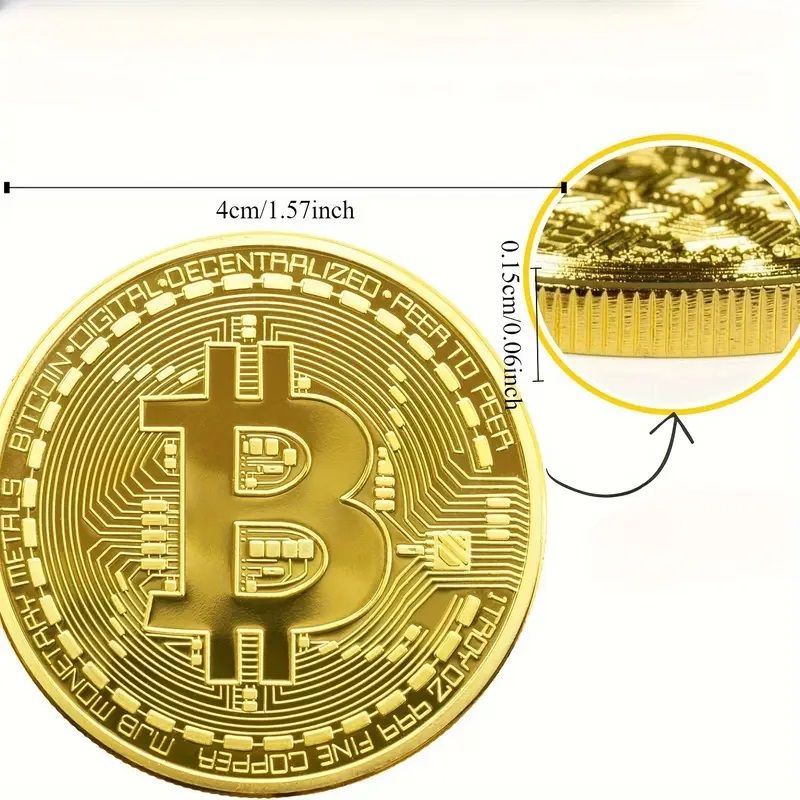 Вона виготовляється з металу і має зображення символу біткоїна (\(B\) з двома вертикальними лініями) на одній стороні, а на іншій — елементи, пов'язані з блокчейном або цифровими візерунками.
