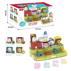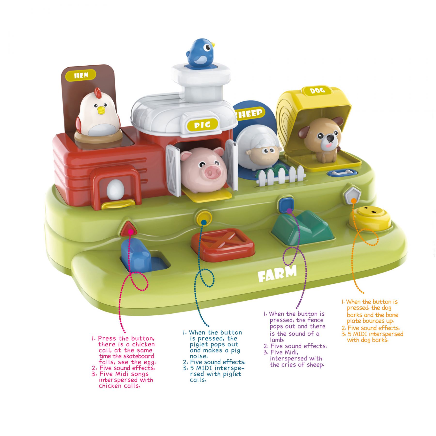 Іграшка оснащена звуковими ефектами, включаючи реалістичні голоси тварин (курка, свиня, вівця, собака), мелодії та пісні.
