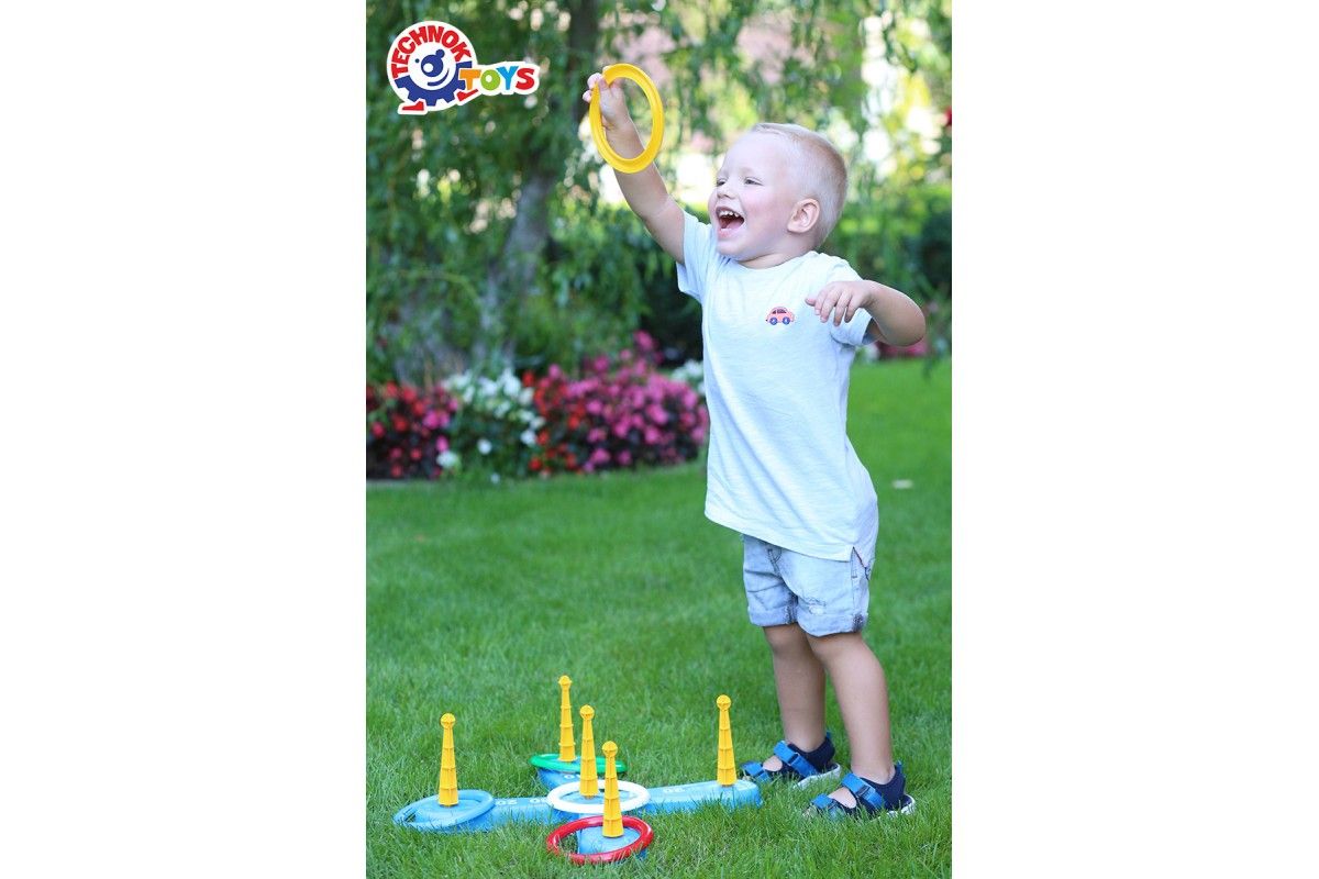 «Кільцекид ТехноК» цікава іграшка для активного відпочинку дітей та дорослих. Її можна використовувати як на свіжому повітрі, так і в приміщенні. Це також динамічна командна гра. Зібравши 2 і більше команди гравців можна влаштувати змагання. Такі активні ігри тренують у дітей дрібну моторику, спритність та влучність, виховують лідерські якості та цілеспрямованість. Перед початком гри необхідно зібрати хрестоподібну основу і вставити в отвори стержні, на які накидають кільця. Біля кожного стержня є числа 10,20,30,50. Це — кількість балів, які набирає гравець при накиданні кільця на відповідний стержень. Переможцем стає той, хто набирає більшу кількість балів. У наборі: хрестоподібна основа з двох частин, стержні та кільця по 5 шт. Розміри 48 x 48 x 12 см. Вага 350 г. Пакування Сітка.