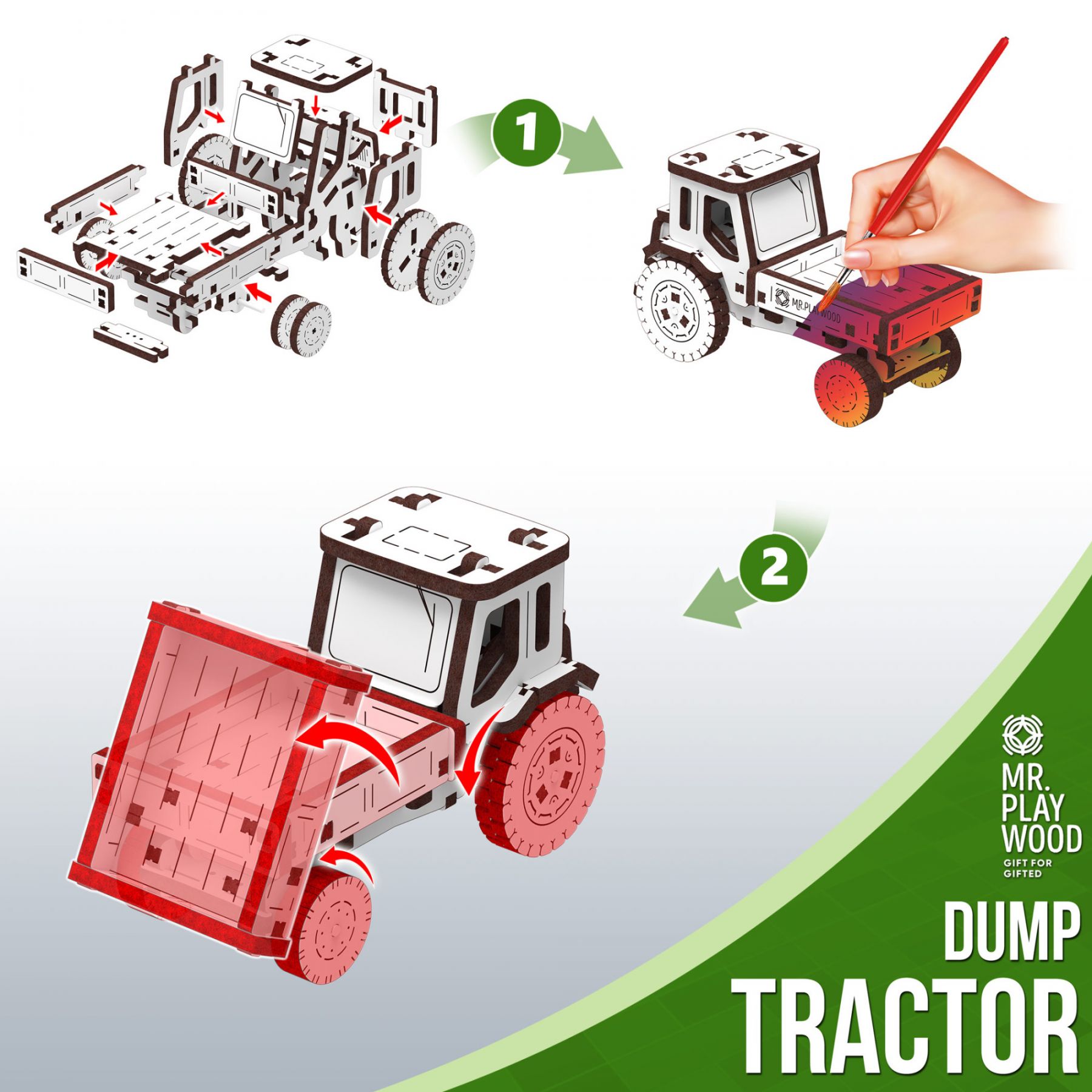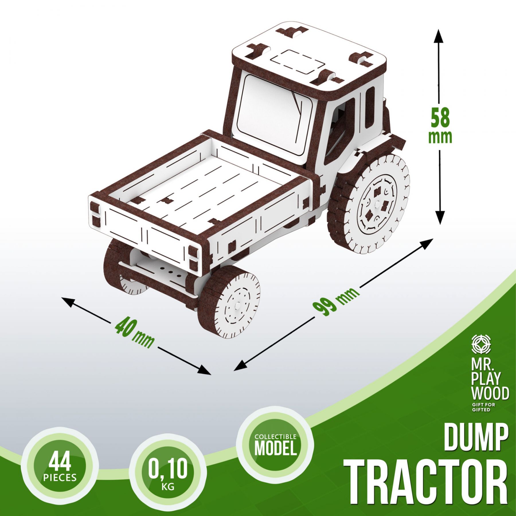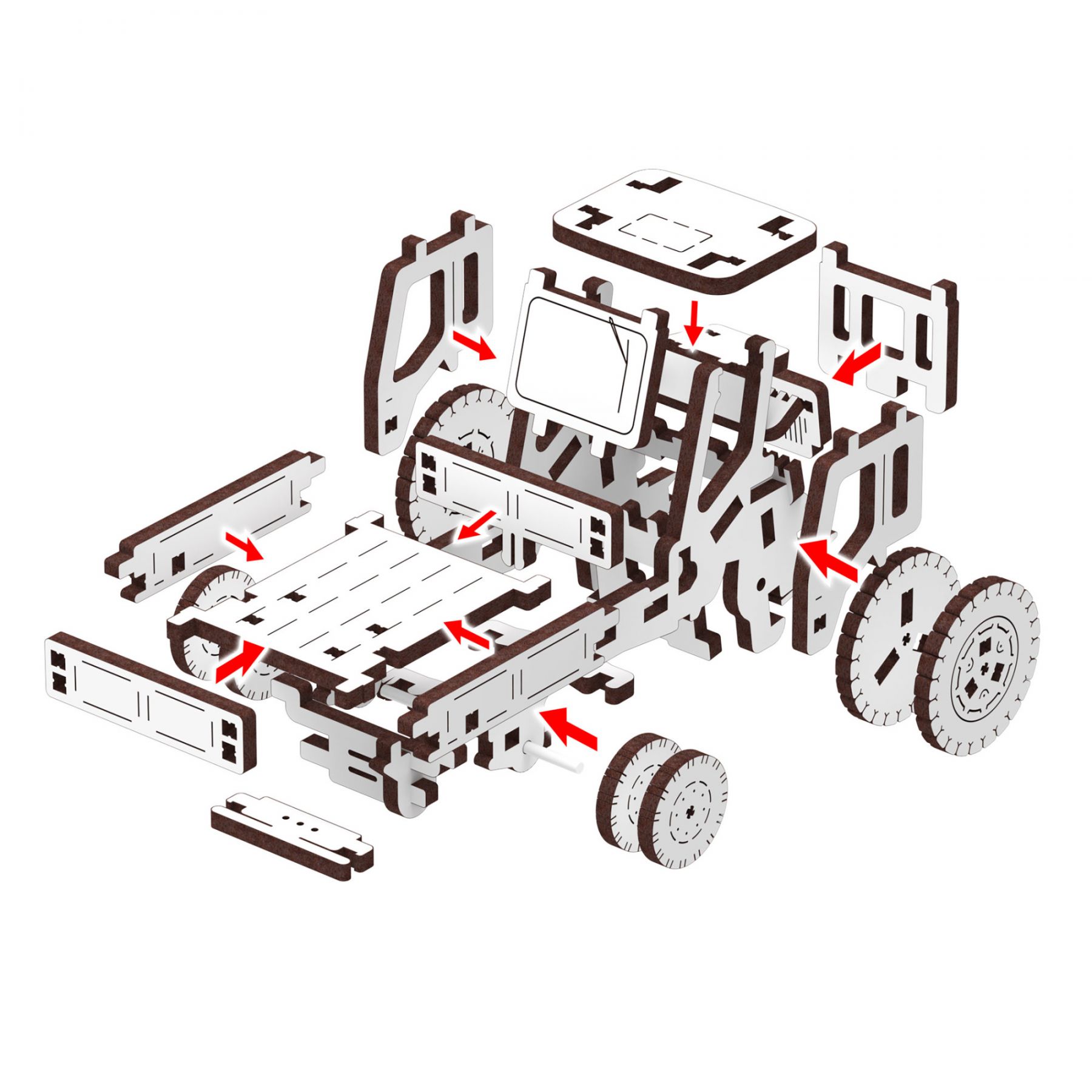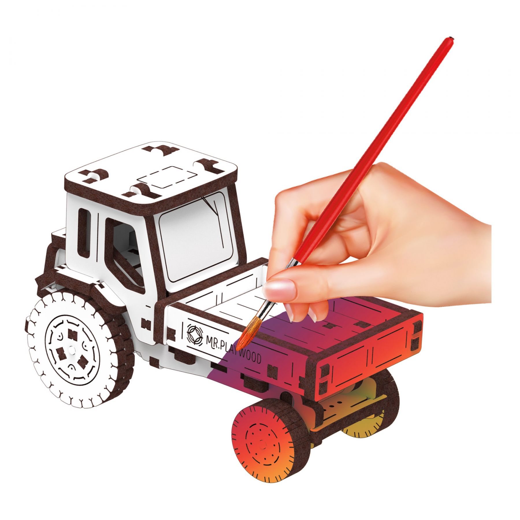 Акуратно від'єднайте деталі від пластин і зберіть дерев'яний комплект без клею. Всі необхідні деталі входять в комплект. Збирайте та насолоджуйтесь незвичайним механічним 3D-транспортом Mr.Playwood!
